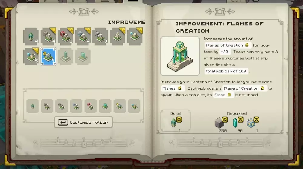 Minecraft Legends features various improvements structures that can be built by teams to gain advantages in the game. One of these improvements is Flames of Creation, which is an improvement structure that increases the flame of creation for the team.