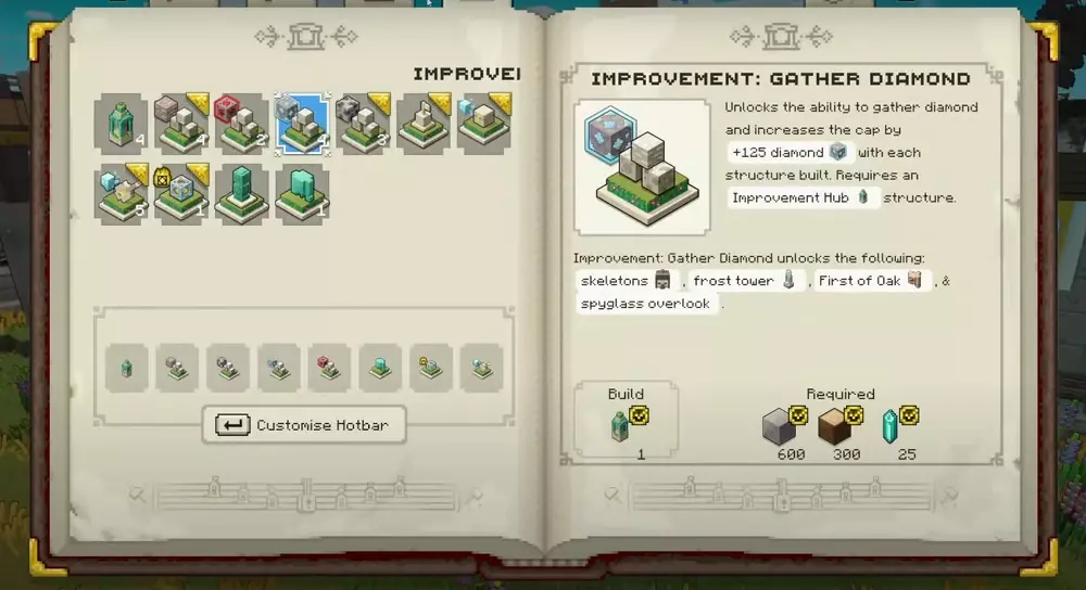 In Minecraft Legends, players can unlock various improvements that can aid in their gameplay. One such improvement is the Gather Diamond structure. This improvement allows players to gather more diamond resources and increases the cap limit.