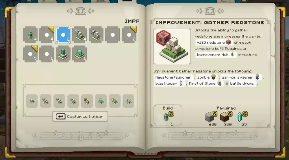 Unlocks the ability to gather redstone and increases the cap by +125 redstone with each structure built. Requires an Improvement Hub structure.
