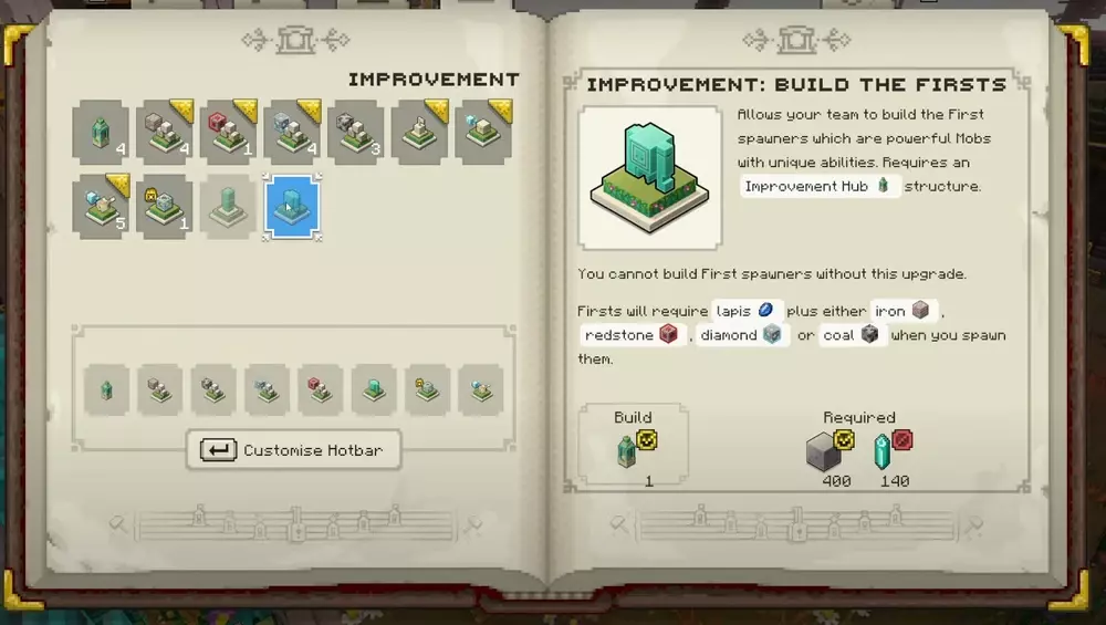 Allows your team to build the Firsts spawners which are powerful mobs with unique abilities. Requires an improvement hub structure.